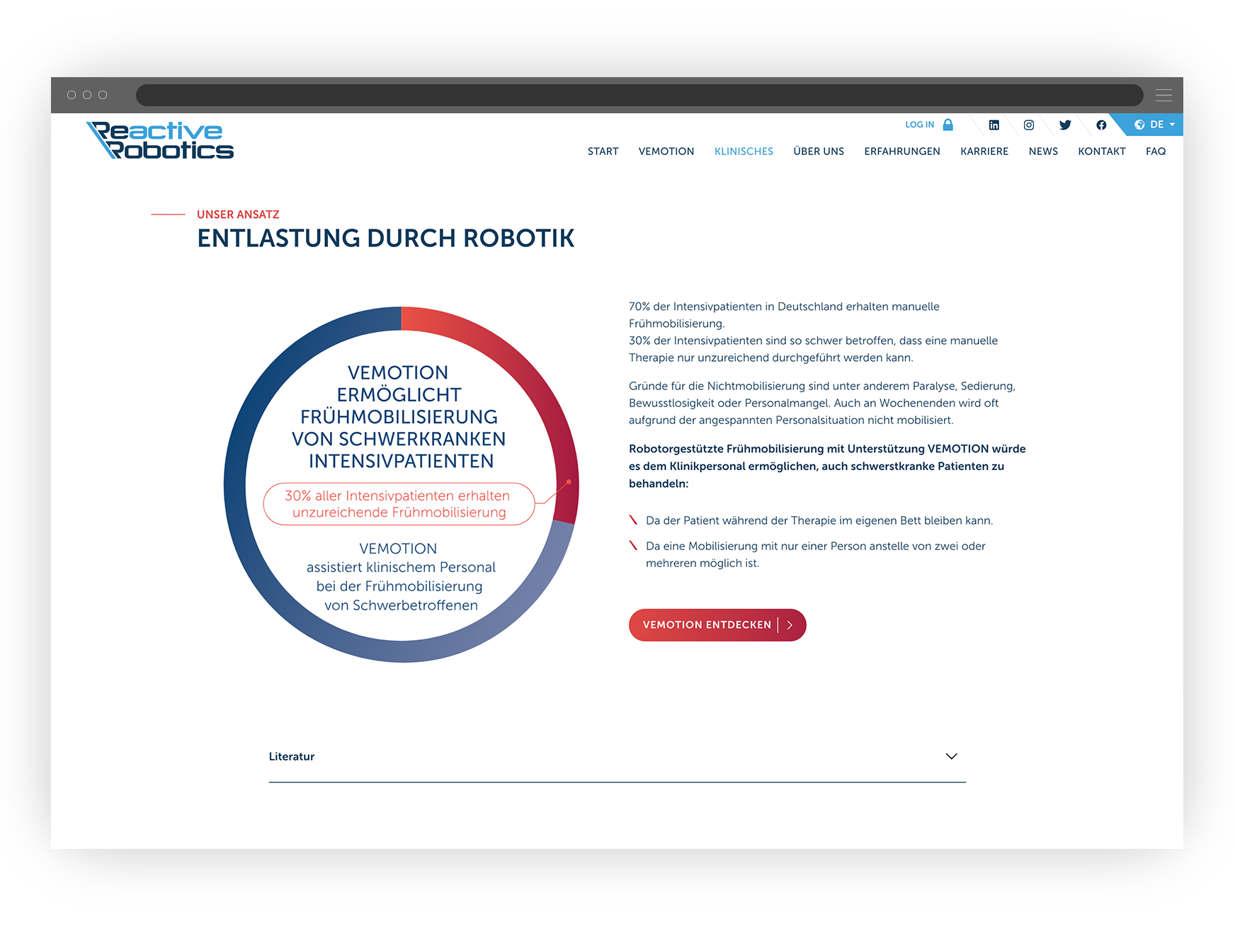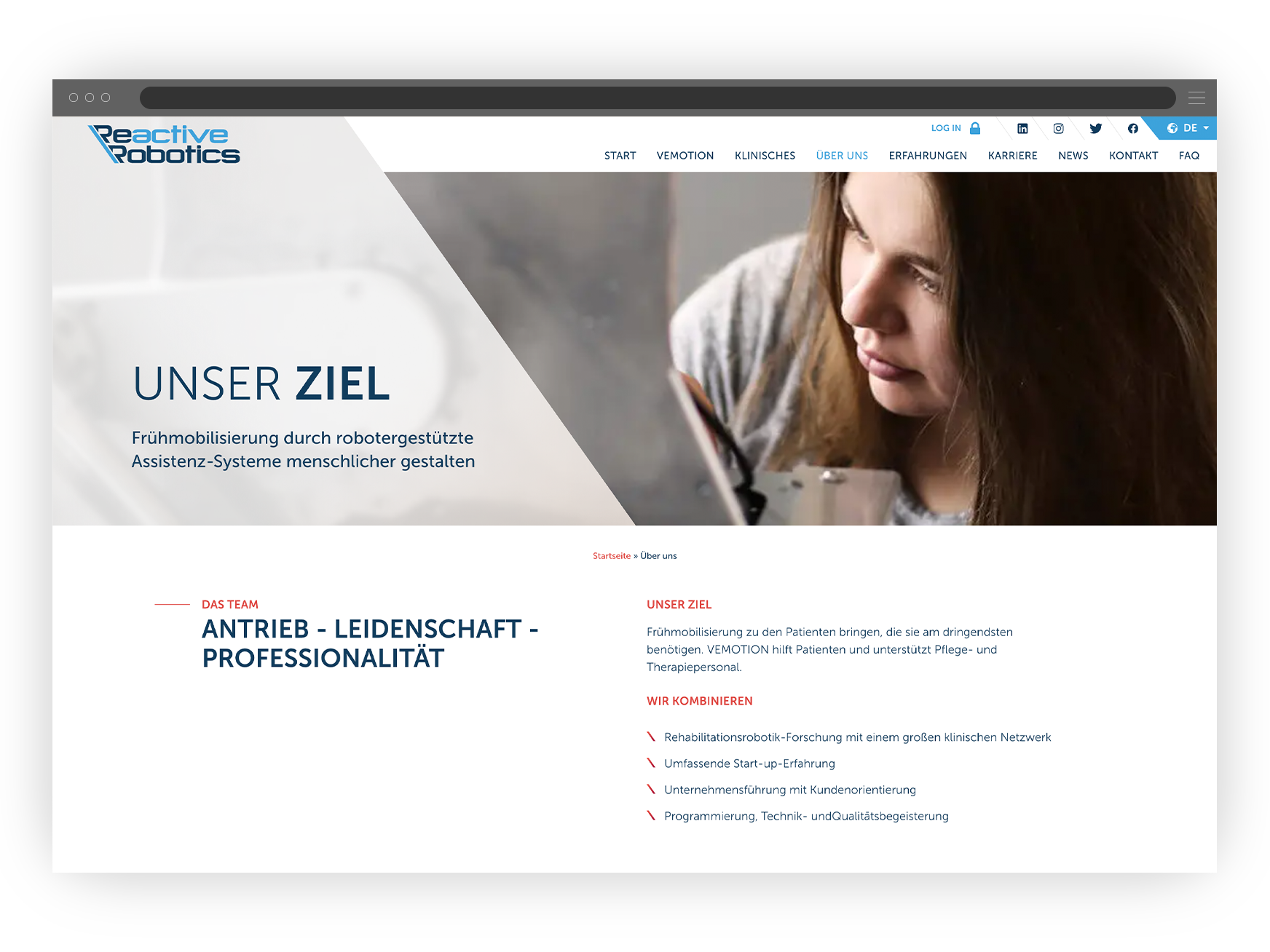 Die Pflegerobotik ist relativ neu. Ein Teil des Pflegepersonals und der Ärzteschaft nutzt es häufig zum ersten Mal. Um die Technik beim „First Touch“ so transparent wie möglich zu kommunizieren, hat unsere Full-Stack-Webentwicklung bereits bei der Konzeption des Mock-ups Klarheit und Expertise in den Mittelpunkt gestellt. Das Resultat ist eine Website mit mehreren Unterseiten, welche die Health-Care-Technik in den Mittelpunkt stellt.