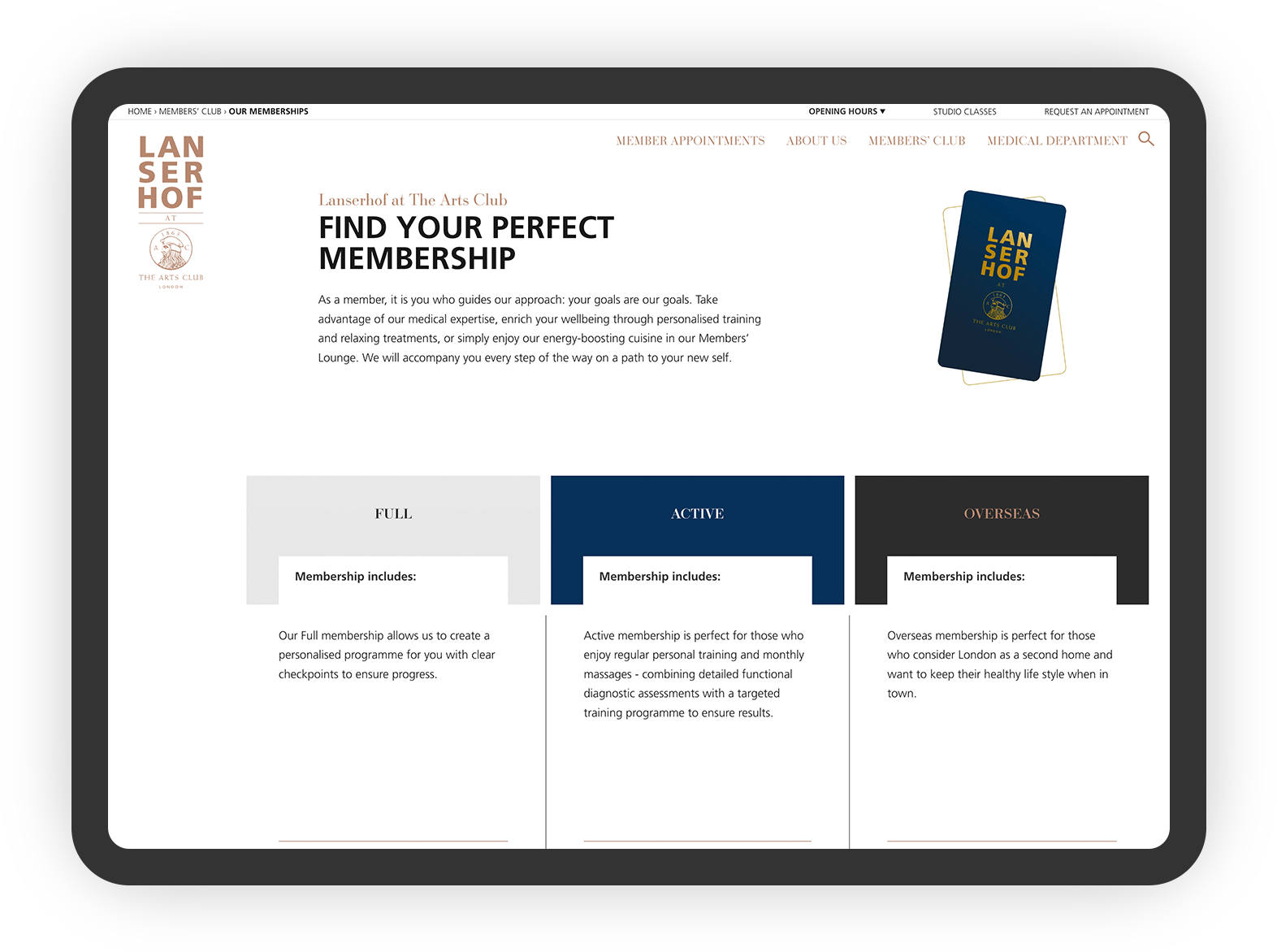 Um das luxuriöse Angebot perfekt zu präsentieren, hat sich unsere Digitalagentur einiges einfallen lassen. Zunächst entwickelten unsere Full-Stack-Designer und UI-Designer ein Mock-up mit einem dynamischen dreigeteilten Mouseover-Header. In diesem Triptychon werden die drei Hauptkategorien Wellness und Fitness, Diagnostik und Behandlung sowie Biomechanik und Physiologie mit ausdrucksstarken Produktfotografien und überzeugenden Imagefilmen angezeigt.
